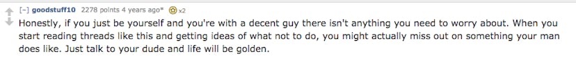 A recent AskReddit thread looked at things women think turn men on it but, in reality, don’t do a damn thing — or actively turn people off. Now, on the one hand, it’s no surprise that there’s some real sexist BS in there — and ultimately, it shouldn’t matter what a guy thinks of your behavior as long as you’re happy and kind. And it’s also a little ridiculous to think that any man is going to be able to speak to what turns all men on or off, but it’s still interesting to get an insight into some men’s minds.
